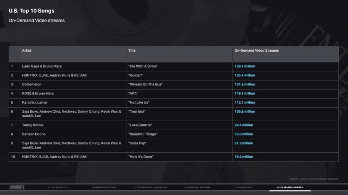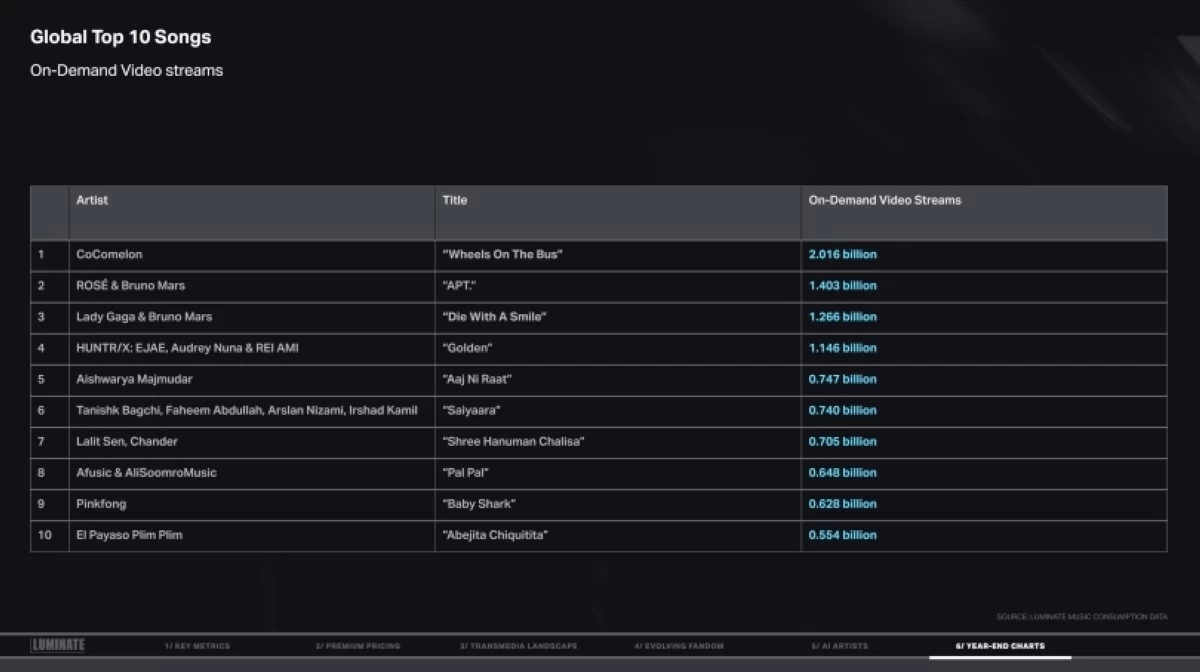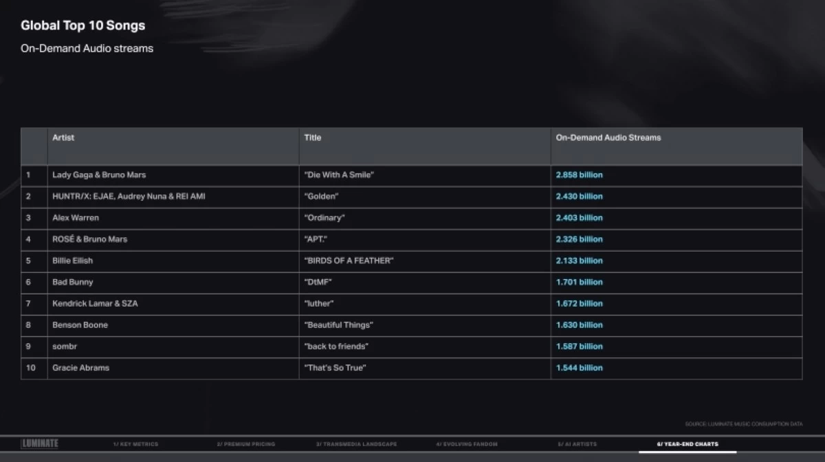 Luminate, which supplies data to Billboard charts, released its 2025 Year-End Music Report, which presented data on global streaming and consumption, and year-end charts.