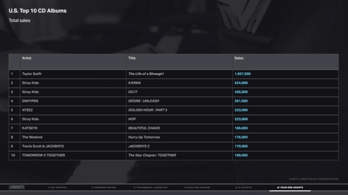 In the total sales for the 2025 US Top 10 CD Albums, Taylor Swift’s “The Life of a Showgirl“ ranked No. 1 with sales of 1.95 million.