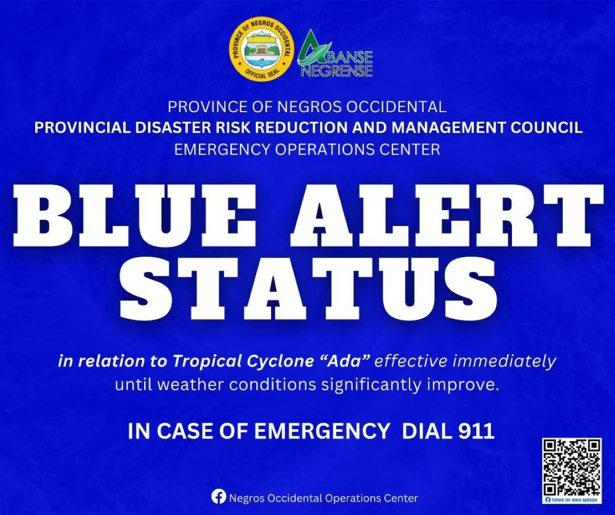 BACOLOD CITY – The Provincial Disaster Risk Reduction and Management Council (PDRRMC) Emergency Operations Center (EOC) in Negros Occidental has been placed on blue alert status for tropical storm "Ada."