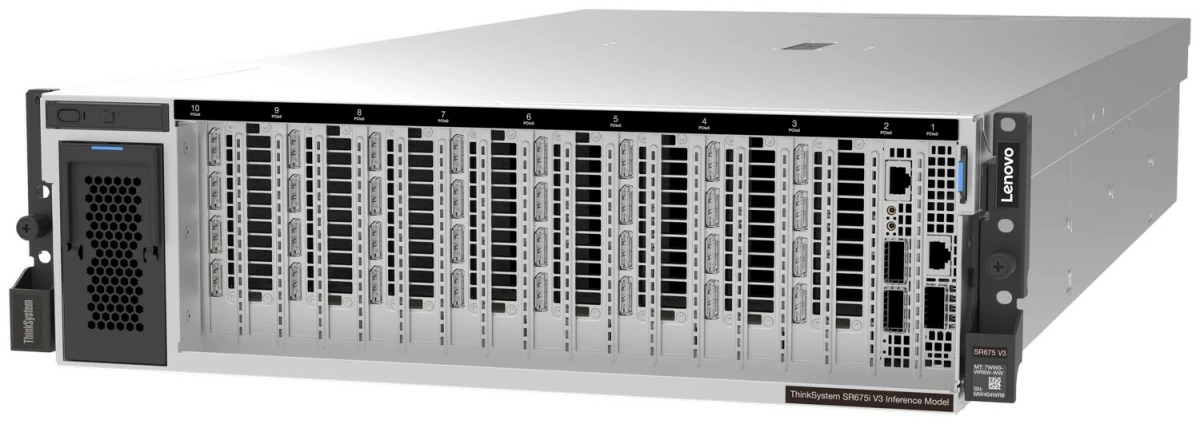 Lenovo ThinkSystem SR675i: Powerhouse performance, AI inferencing server built to run full LLMs anywhere with massive scalability, for the largest workloads and accelerated simulation in manufacturing, critical healthcare and financial services environments.