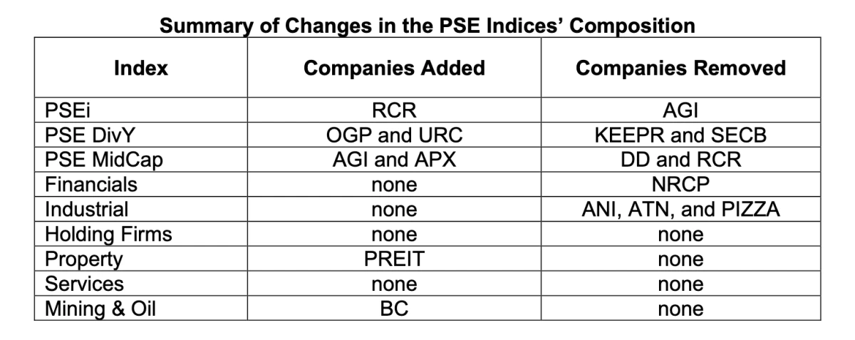 The sectoral indices also underwent revisions, with Premiere Island Power REIT Corp. added to the Property Index and Benguet Corp. added to the Mining & Oil Index. No companies were removed from either gauge during this cycle. However, the Financials Index will shrink as the National Reinsurance Corporation of the Philippines was removed with no replacement named.