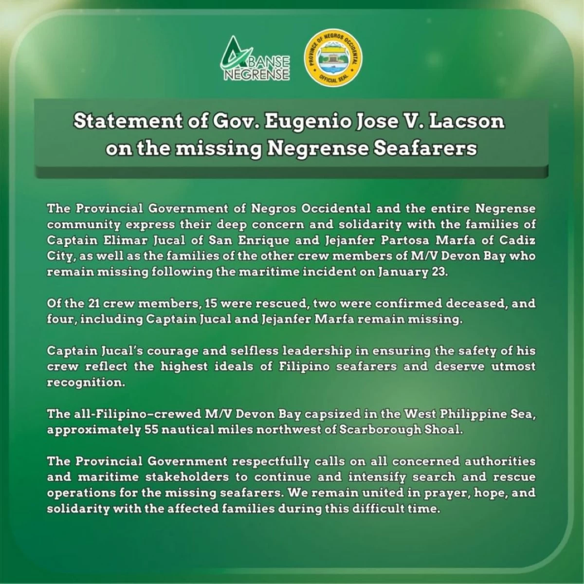 BACOLOD CITY – The provincial government of Negros Occidental has called on authorities and maritime stakeholders to continue and intensify search and rescue operations for two missing seafarers of MV Devon Bay.
