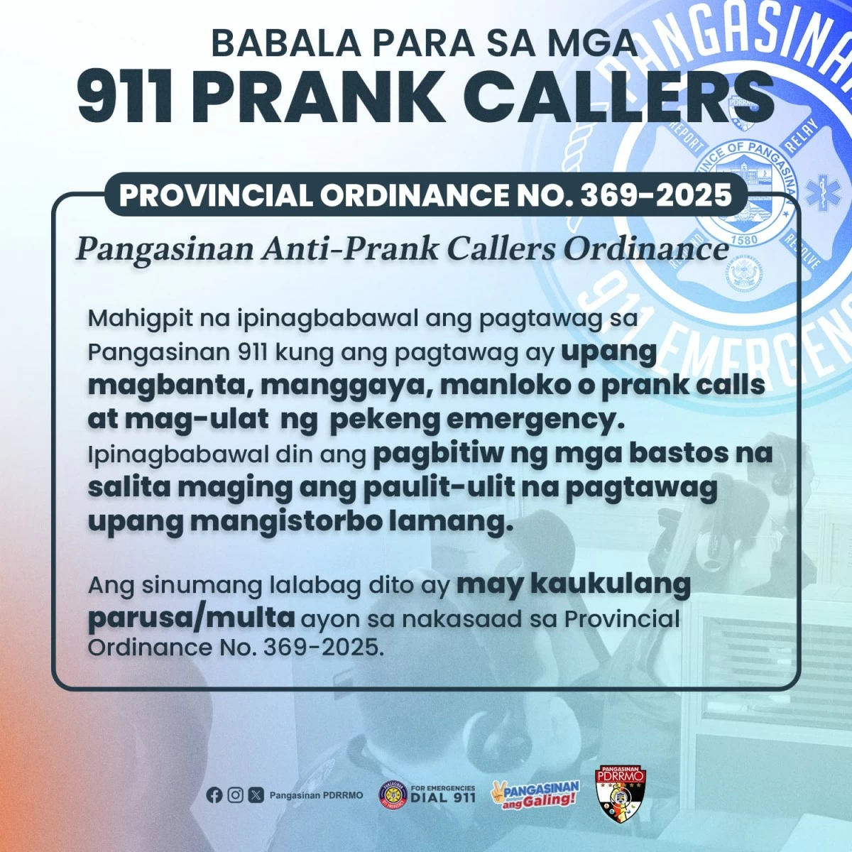 To address this, the Sangguniang Panlalawigan enacted Provincial Ordinance No. 369-2025, the Pangasinan Anti-Prank Callers Ordinance, on Jan. 20, 2026.