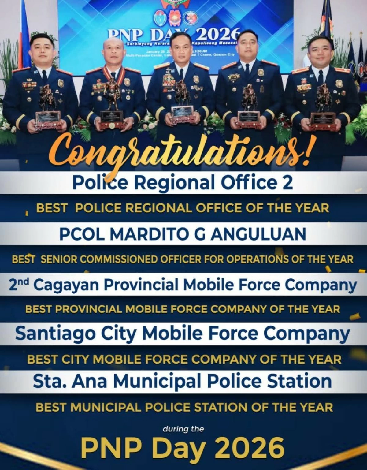 The Philippine National Police awarded Police Regional Office-2 as the Best Police Regional Office during the 26th PNP Day on Thursday, Jan. 29, in Camp Crame in Quezon City.