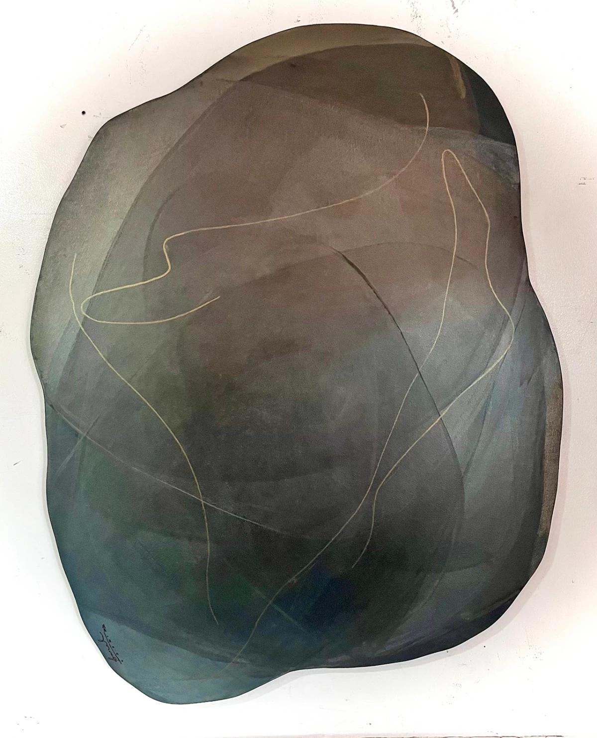 Naomi’s days spent in research and development, pushing boundaries of shapes and textures, have clearly informed her current practice. In the exhibit, she translates that love for experimentation into canvases that defy the standard rectangle, opting instead for organic-shaped structures that feel like they are breathing