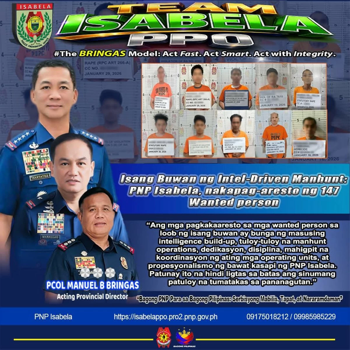 Isabela police chief Police Col. Manuel B. Bringas credited their arrest to sustained intelligence gathering, disciplined operations, and close coordination among police units and community partners.