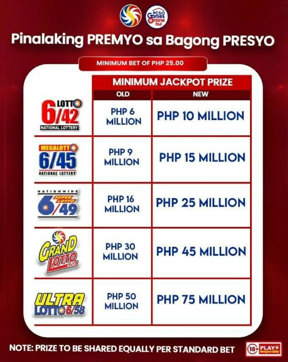 Under the updated prize structure, the minimum jackpot prize for Lotto 6/42 is set at ₱10 million; Mega Lotto 6/45 at ₱15 million; Super Lotto 6/49 at ₱25 million; Grand Lotto 6/55 at ₱45 million; and Ultra Lotto 6/58 at ₱75 million.