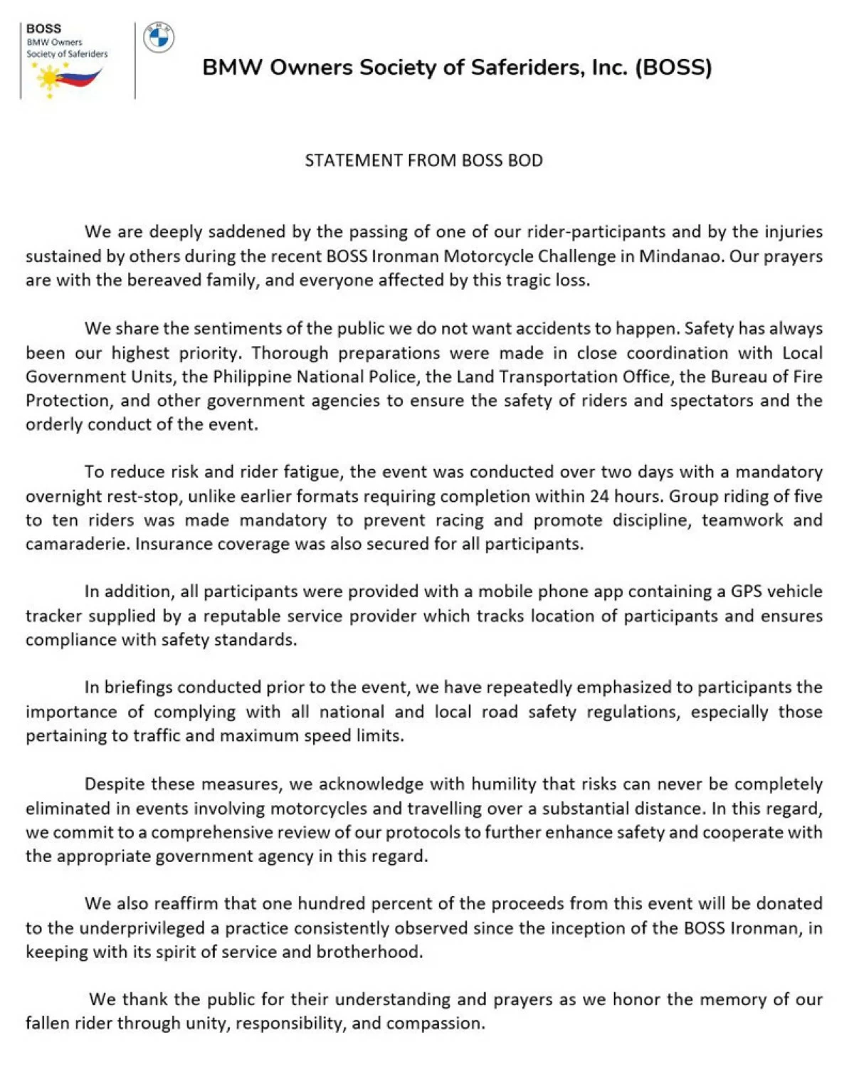 - BMW Owners' Society of Safe Riders (BOSS), the organizers of the event have released a statement, saying it has coordinated with LGUs and concerned agencies prior to the event, as well as implemented changes to its event in the name of safety.