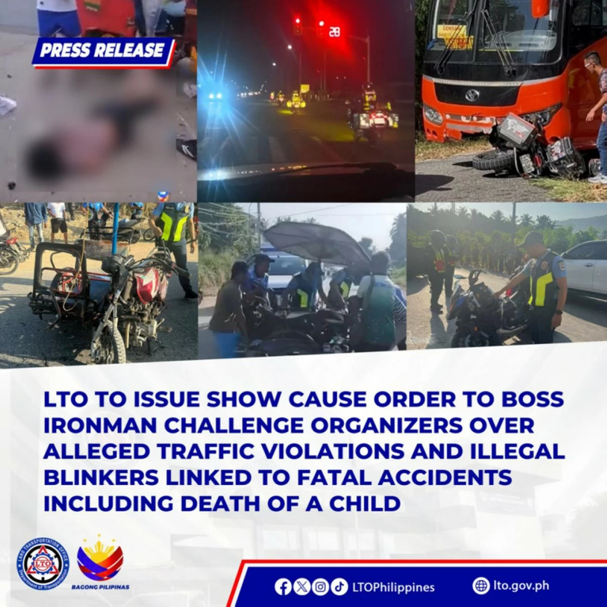 “The heartbreaking footage we saw circulating online is a stark reminder that road safety is non-negotiable – every life on our roads matters, especially the most vulnerable among us like children,” said LTO Chief, Assistant Secretary Markus V. Lacanilao “Private motor vehicle events must never come at the cost of innocent lives. Under Republic Act No. 4136, organizers have a legal and moral obligation to ensure compliance with traffic laws and prioritize safety for all. We will hold accountable those responsible, and this case sends a clear message: compliance is mandatory, and safety must be at the core of all event planning and execution.”