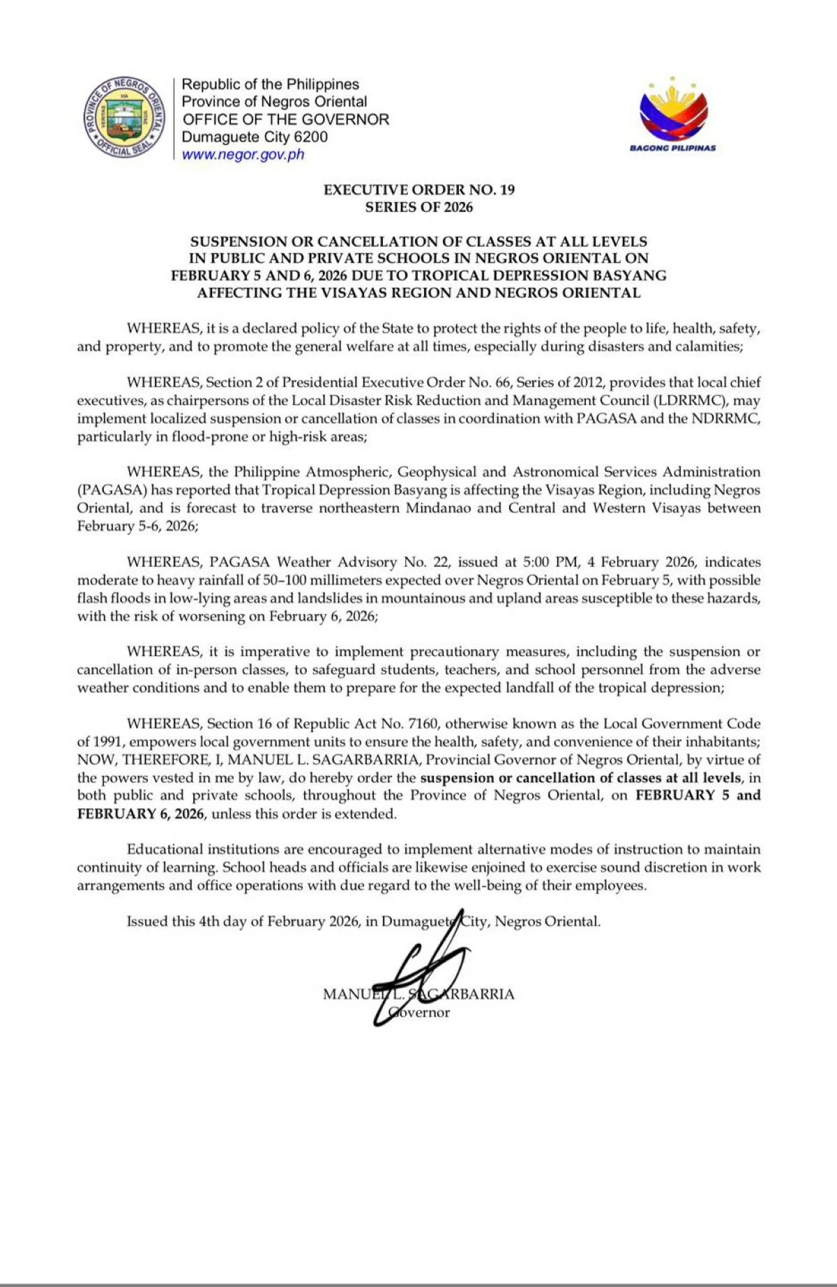 Negros Oriental Gov. Manuel “Chaco” Sagarbarria suspended classes on Feb. 5 and 6 as Basyang will traverse Northeastern Mindanao and Central and Western Visayas between Thursday and Friday.