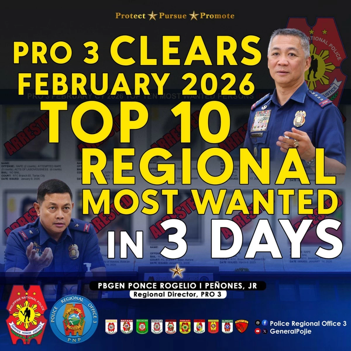CAMP OLIVAS, Pampanga – The Police Regional Office-3 (PRO-3) arrested all individuals listed in its February Top 10 regional most wanted persons list in just three days, from Feb. 1 to 3, through coordinated operations across Central Luzon.