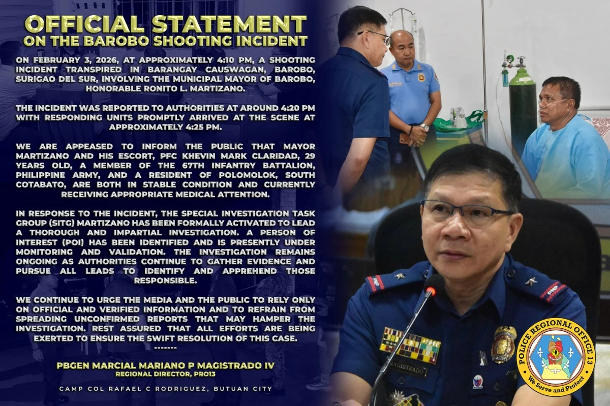 BUTUAN CITY – The Police Regional Office-13 on Thursday, Feb. 5, said they have a person of interest in the ambush of Barobo town, Surigao del Sur province Mayor Ronito L. Martizano on Tuesday, Feb. 3.