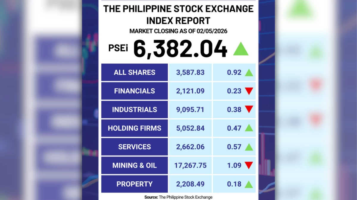 The Philippine Stock Exchange index (PSEi) gained 9.09 points, or 0.1 percent, to close at 6,382.04 on Thursday, Feb. 5.