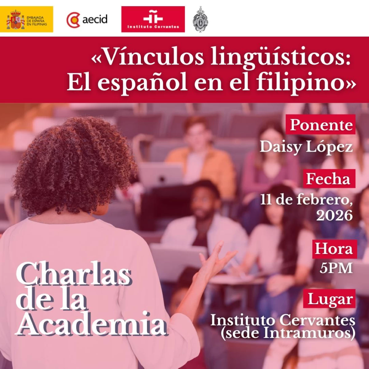 The opening talk, “Vínculos lingüísticos: El español en el filipino” (Linguistic Links: Spanish in Filipino), will be delivered by Academia Director Professor Daisy López. The lecture shines a spotlight on the enduring linguistic ties between Spanish and Filipino, showing how centuries of shared history continue to shape everyday language in the Philippines.