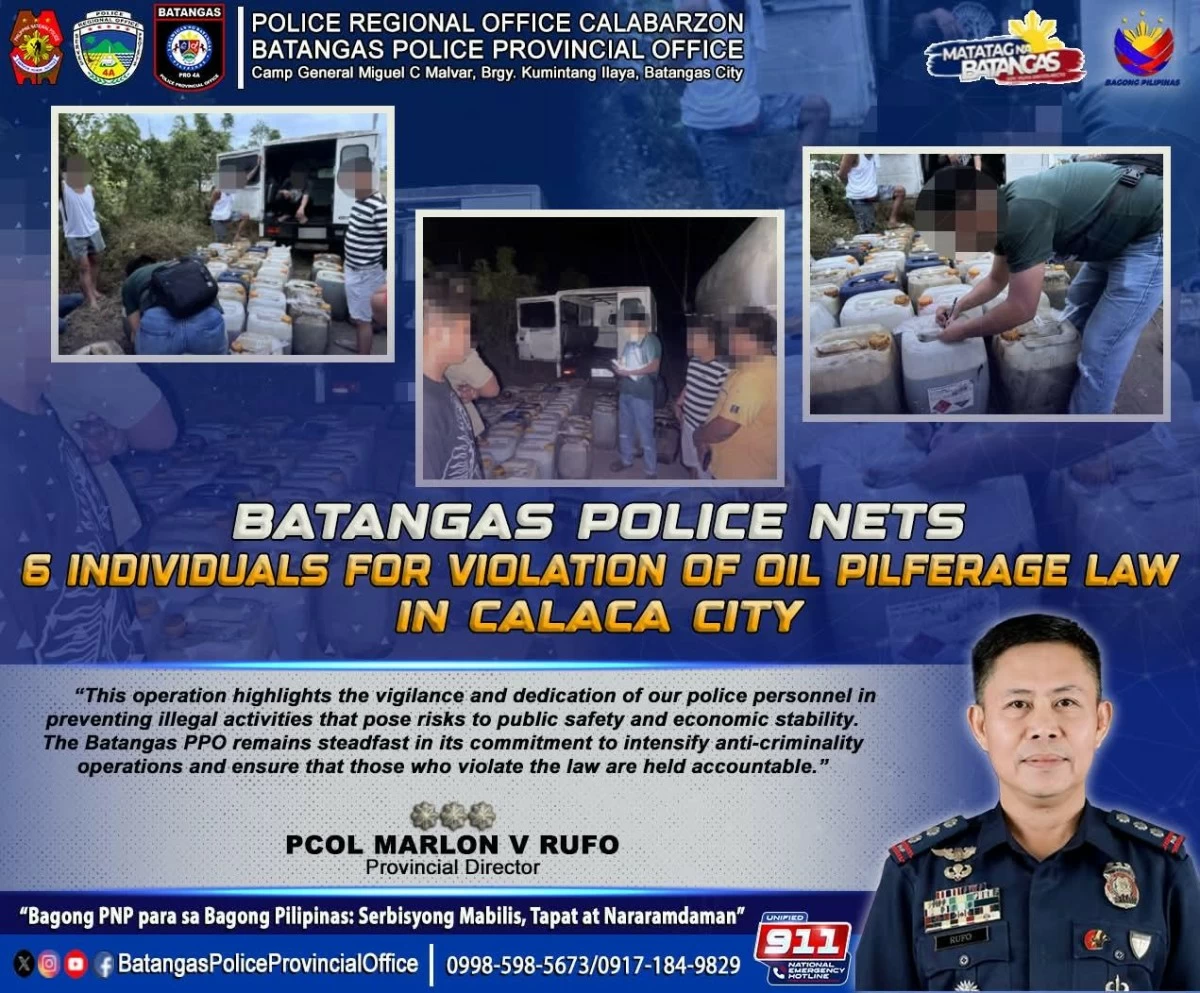 CAMP MIGUEL MALVAR, Batangas City – Police arrested six individuals for allegedly pilfering oil in Barangay Puting Bato West, Calaca City, Batangas on Friday, Feb. 6.
