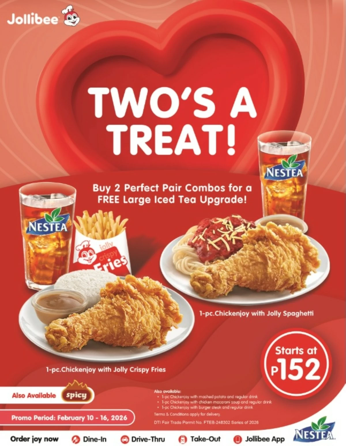 Running from Feb. 10 to 16, the campaign introduces a series of limited-time offers nationwide. Customers who order any two Chickenjoy Value Meals during the period can receive a free upgrade to a large iced tea through the brand’s Perfect Pair Combos.