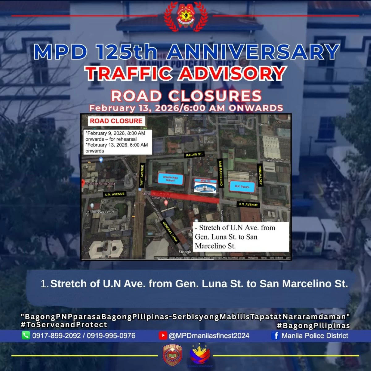 The Manila Police District (MPD) has announced road closures and traffic rerouting schemes on Friday, February 13, 2026, in line with the celebration of its 125th founding anniversary.