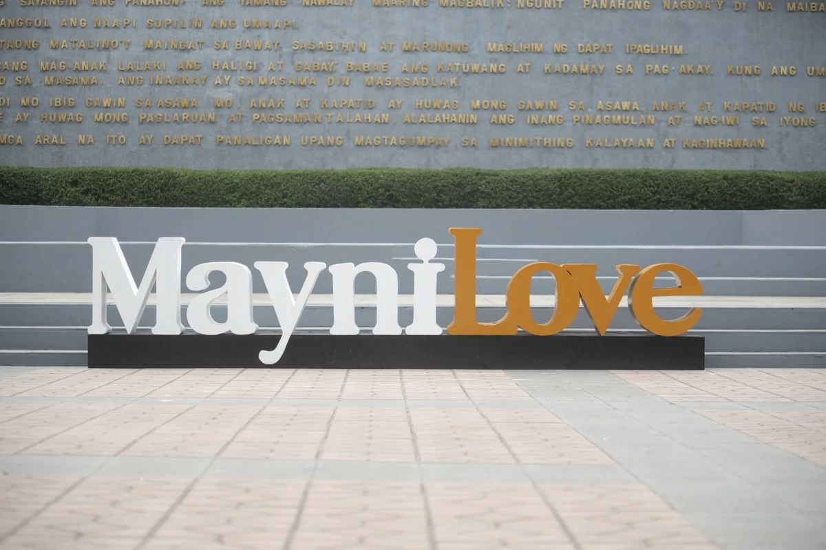 The “MayniLOVE” Valentine’s display at Kartilya ng Katipunan features an illuminated “LOVE” sign and a food bazaar with affordable meals, drawing couples, families, and friend groups alike.
