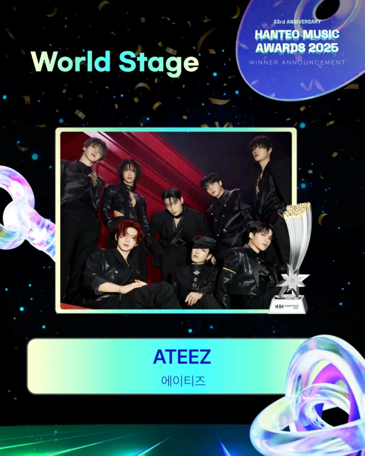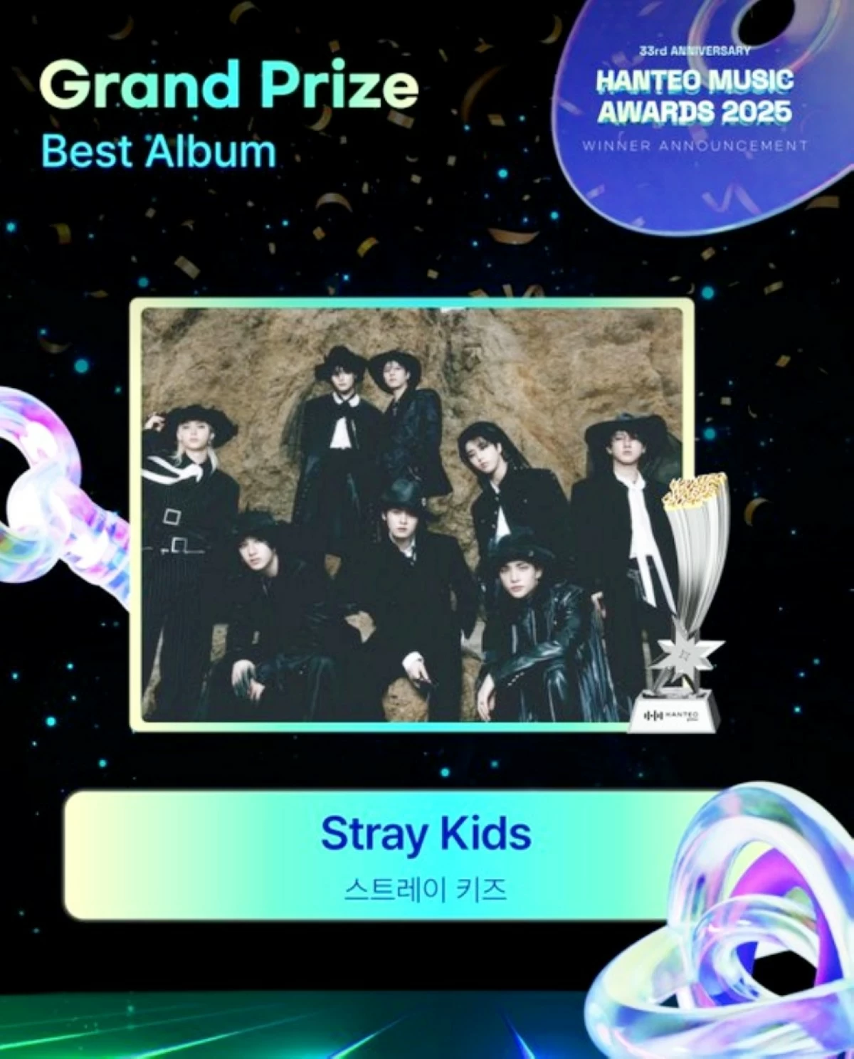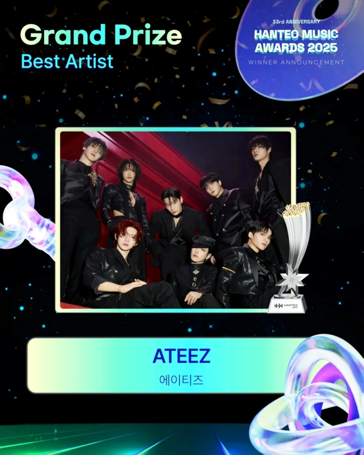 ATEEZ, Stray Kids, ENHYPEN and G-Dragon won the grand prizes (“daesang”) at the Hanteo Music Awards 2025 held on Feb. 15 at the KSPO Dome in Seoul.