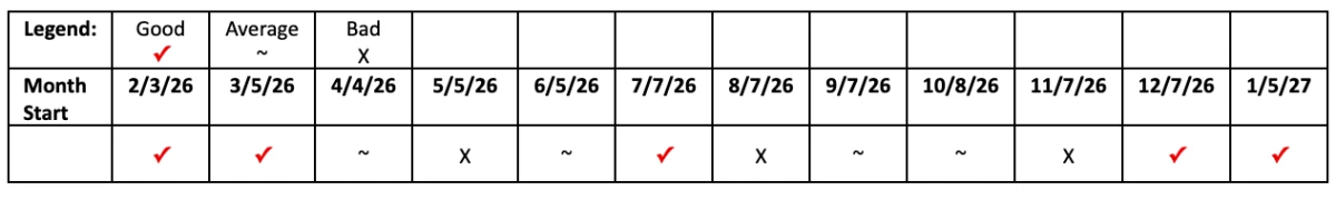 This table below gives an overview of the monthly trend and how the Pigs will fare. The months with a ✓ mean that it will be a pretty good and smooth month. The months with an ~ signify an average luck month where some aspects will be okay but other aspects may encounter some obstacles. The months with a X signify that the luck is weak so it will be good to prepare and exercise extra caution. The start date of the months is also indicated.