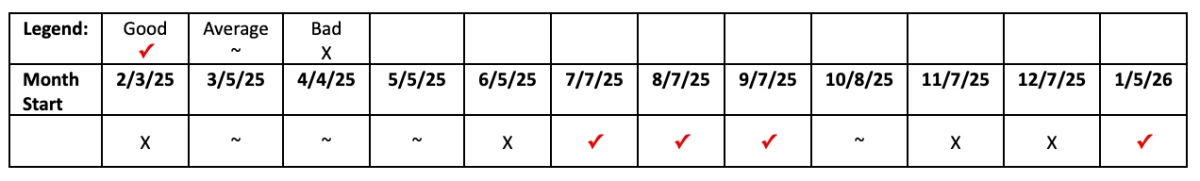 This table below gives an overview of the monthly trend and how the Snakes will fare. The months with a ✓ means that it will be a pretty good and smooth month. The months with an ~ signify an average luck month where some aspects will be okay but other aspects may encounter some obstacles. The months with a X signify that the luck is weak so it will be good to prepare and exercise extra caution. The start date of the months is also indicated.