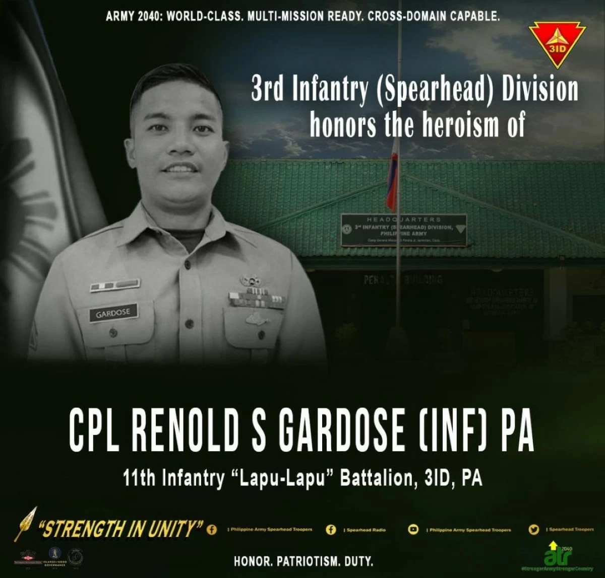 BACOLOD CITY – The Philippine Army 3rd Infantry Division (ID) honored Corporal Renold Gardose who was killed in an encounter with the New People’s Army (NPA) in Barangay Santo Niño, Tanjay City, Negros Oriental on Feb. 15.