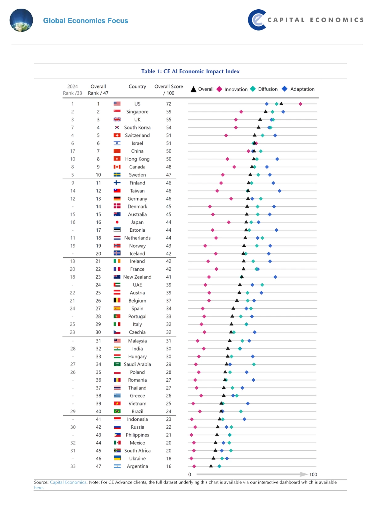 According to Capital Economics, the US leads due to its strength in both AI innovation and widespread adoption, while China initially scored high in innovation when the index was first published in 2023 but lagged in its ability to diffuse and apply AI across the economy.