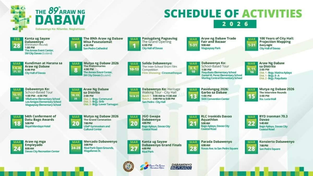Among the significant highlights are the Araw ng Dabaw Trade Fair and Bazaar, the “100 Years of City Hall: Projection Mapping” show, Kundiman at Harana sa Araw ng Dabaw, and the Mutya ng Dabaw 2026 pageant.