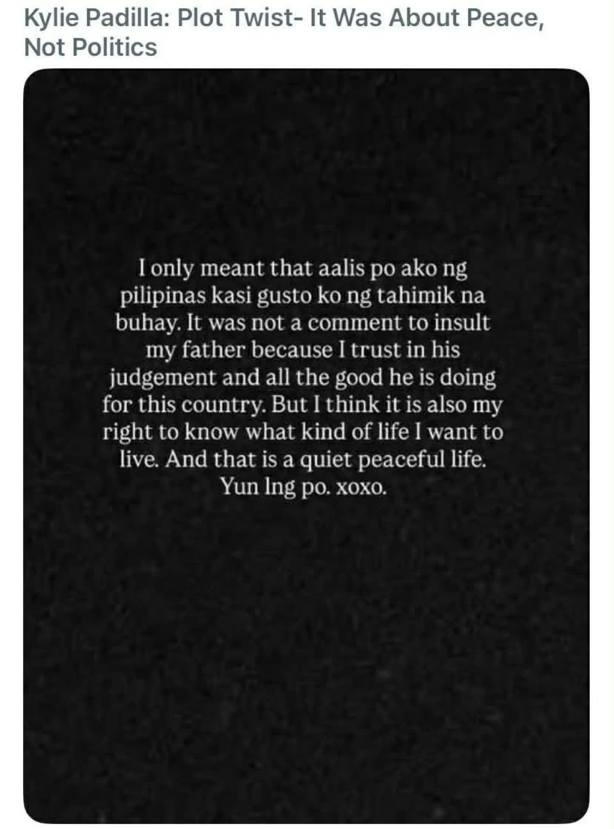 "But I think it is also my right to know what kind of life I want to live. And that it is a quiet, peaceful life. Yun lang po," Kylie said.