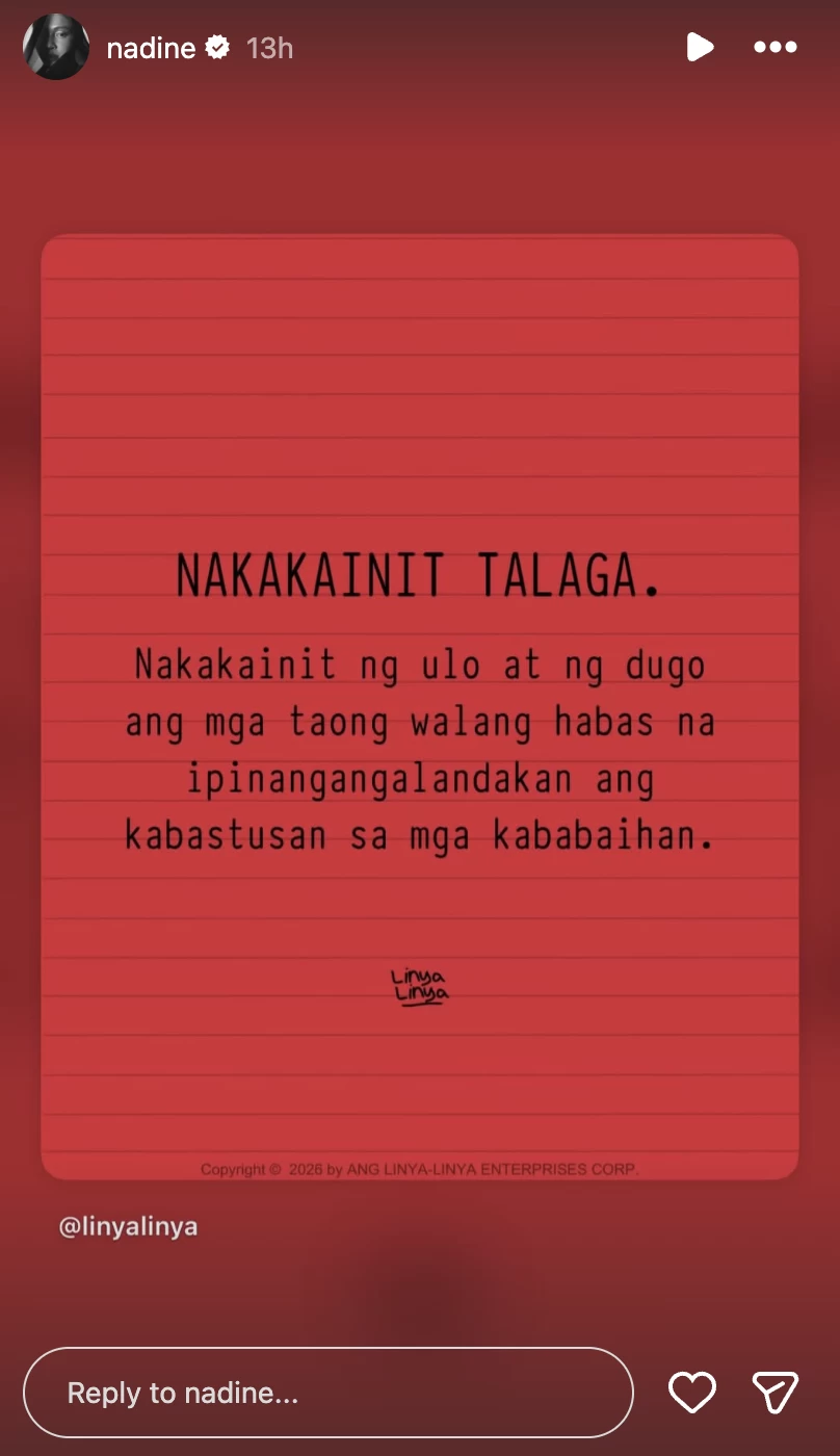 Nadine Lustre's post read, "Nakakainit talaga. Nakakaiinit ng ulo at ng dugo ang mga taong walang habas na ipinangangalandakan ang kabastusan sa mga kababaihan. (It's infuriating and deeply disturbing to witness people openly boasting about their mistreatment of women.)"