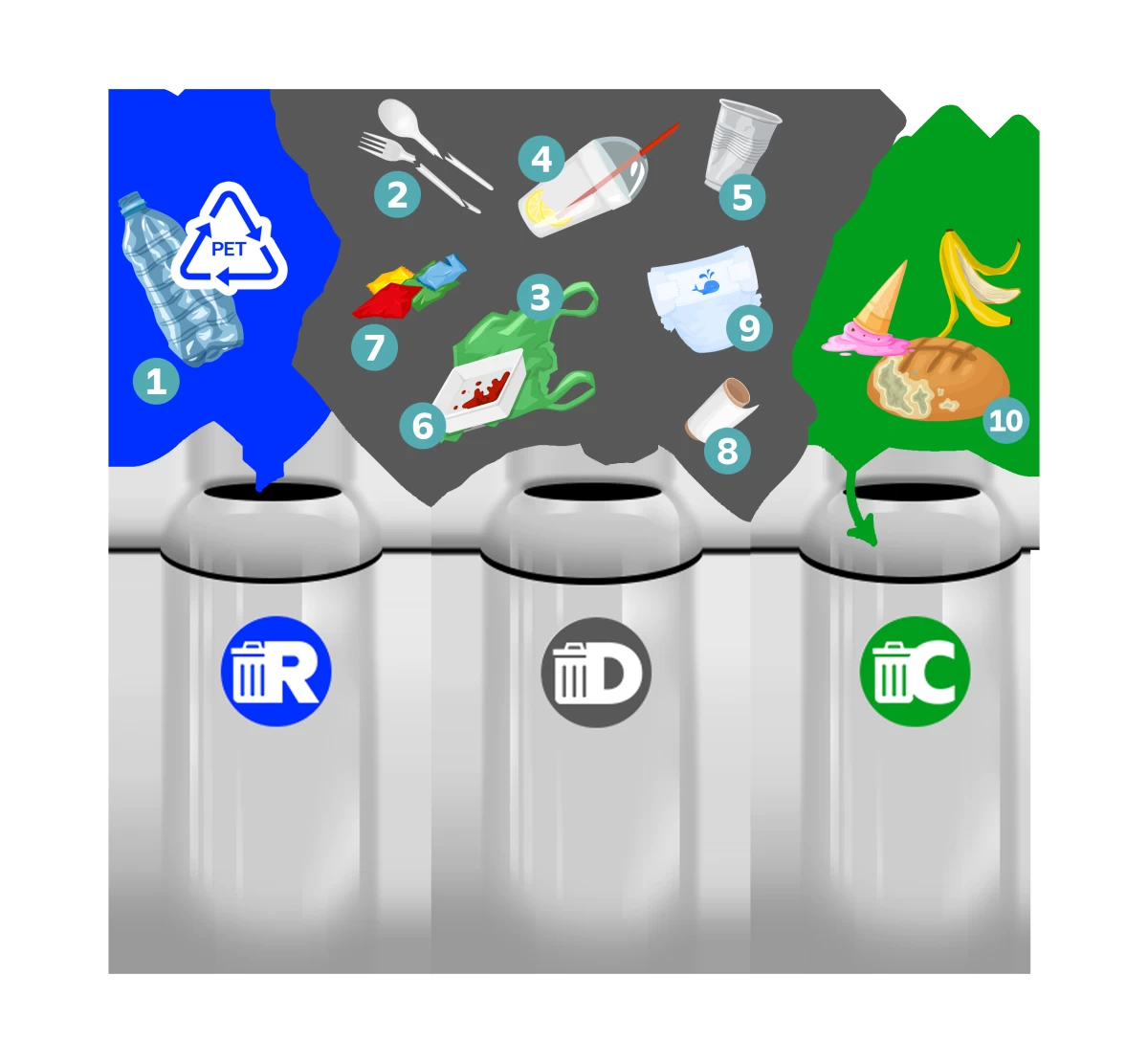 Disposable items and containers such as plastic cutlery, single-use plastic, plastic cups from coffee or milk tea, soiled coffee paper cups and food containers, food packaging and sachets, and soiled tissue or napkins, diapers, and sanitary products are for tossing into the gray "Disposable" Bins.