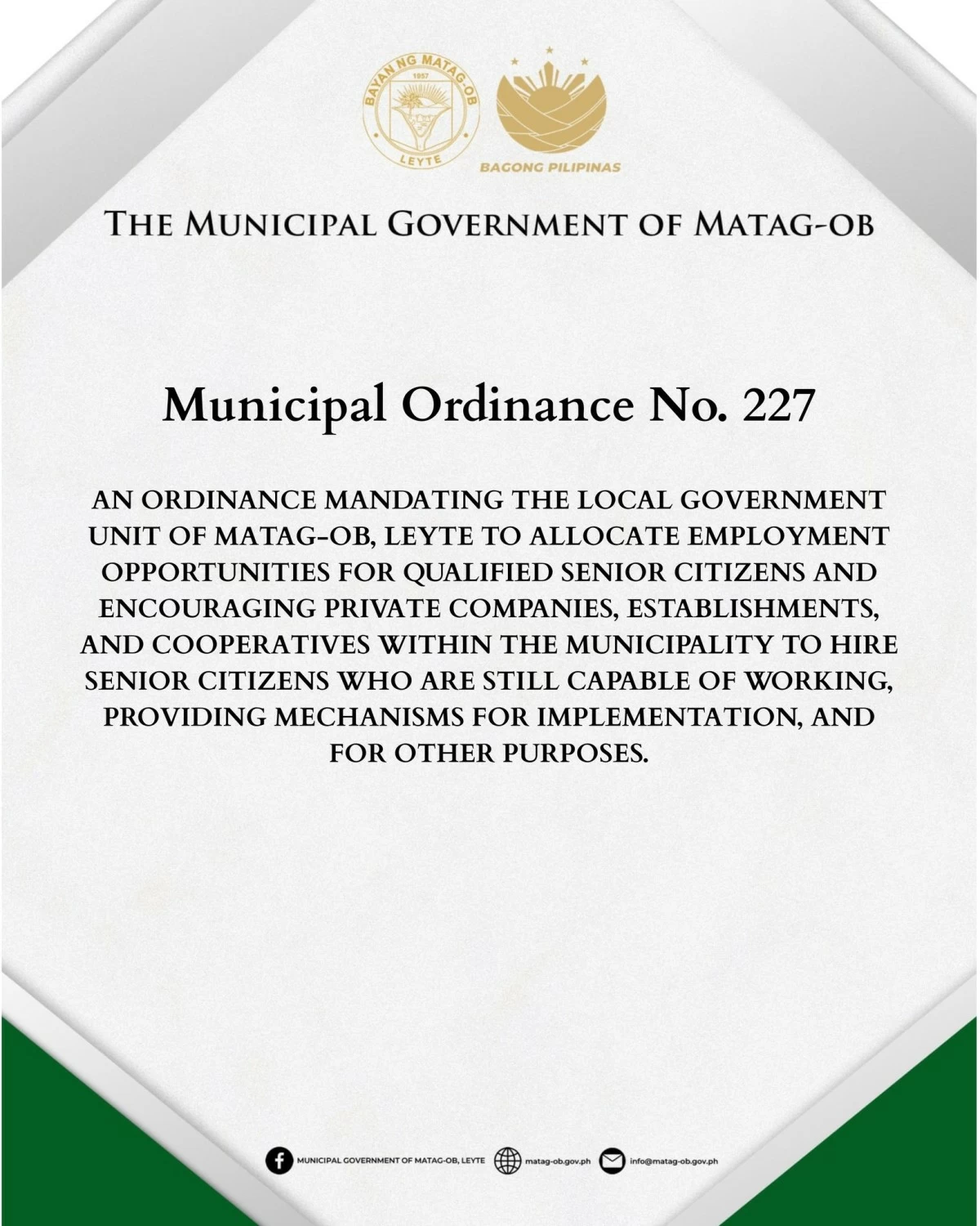 Municipal Ordinance No. 227, Series of 2025, mandates the creation of employment opportunities for qualified senior citizens and encourages private companies, establishments, and cooperatives to hire at least one part-time, contractual, or regular senior citizen employee.