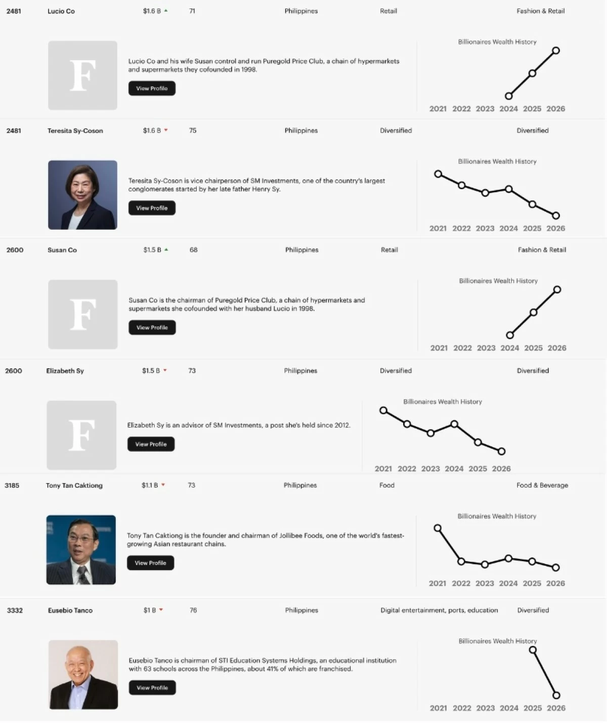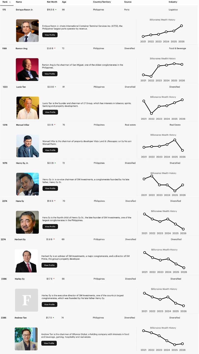 The shift at the top of the wealth rankings follows the decline in the fortune of Manuel “Manny” Villar. Once celebrated as the first Filipino “trillionaire” in peso value with a peak net worth of $17.2 billion in 2025, Villar’s standing was upended by a controversy surrounding land valuations.