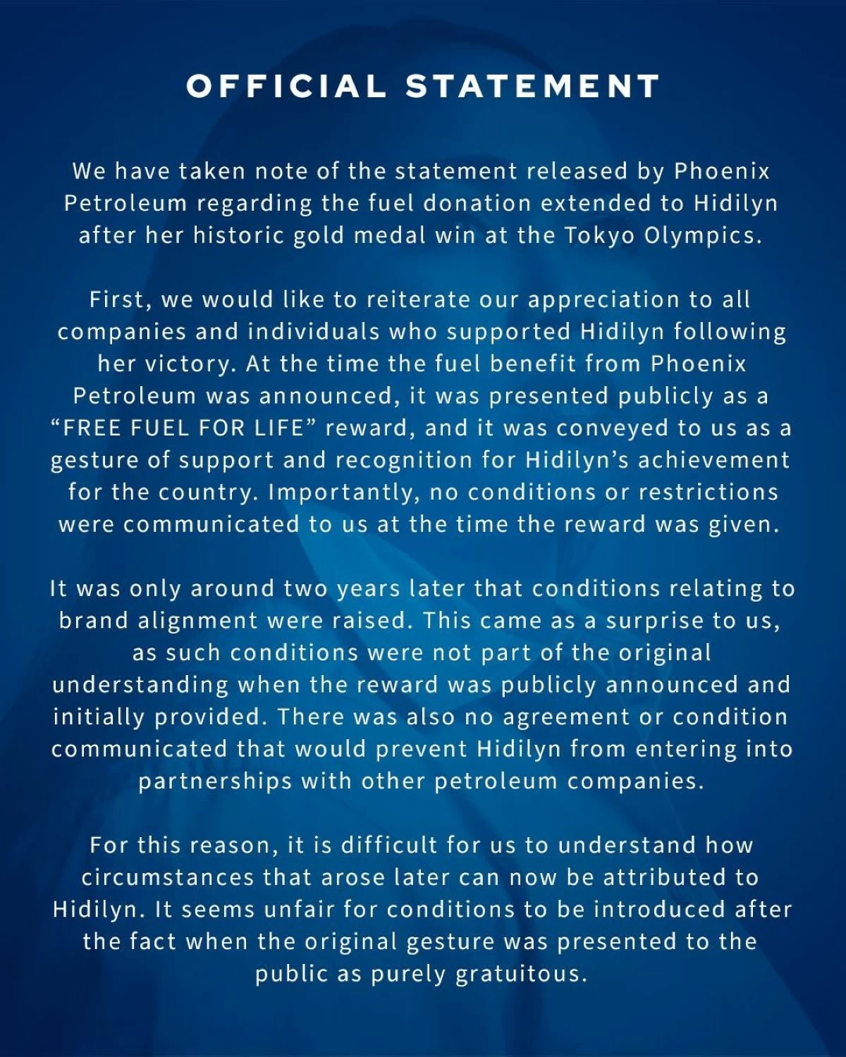 “First, we would like to reiterate our appreciation to all companies and individuals who supported Hidilyn following her victory. At the time the fuel benefit from Phoenix Petroleum was announced, it was presented publicly as a ‘Free Fuel For Life’ reward,” Ferrer wrote.