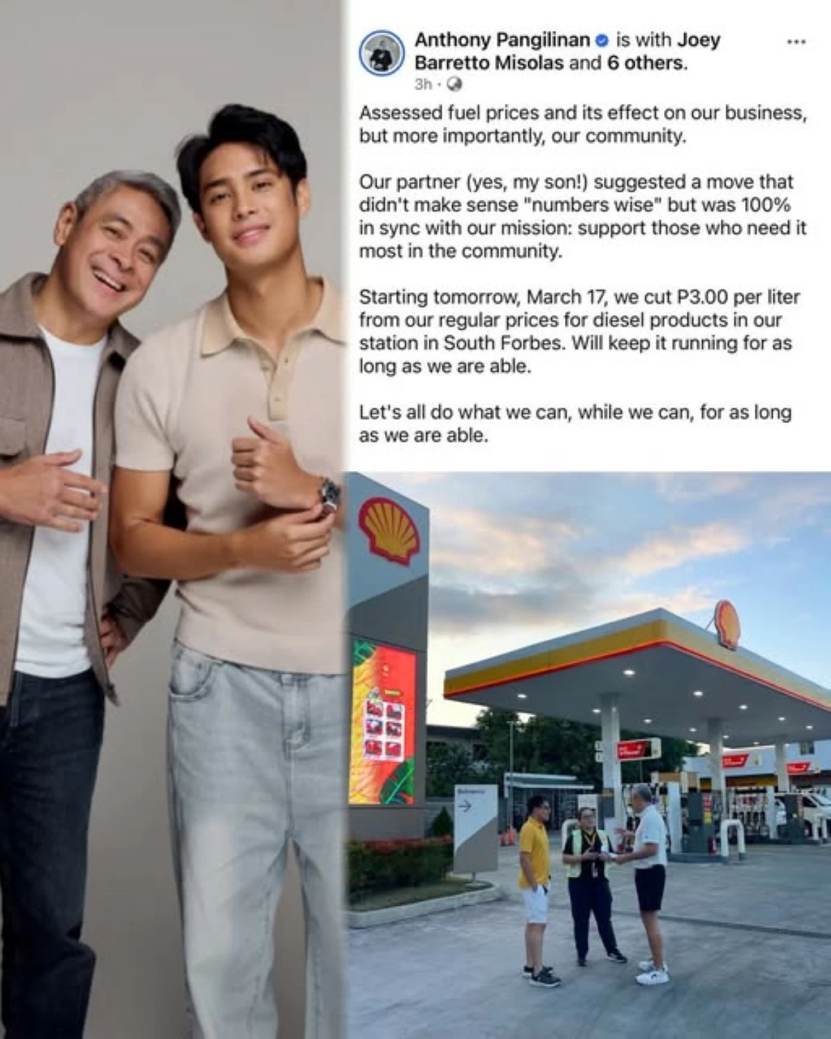 In his post, Anthony shared that Donny, fresh off the successful action series “Roja,” suggested cutting ₱3 per liter from diesel prices at their family-run gas station in South Forbes.