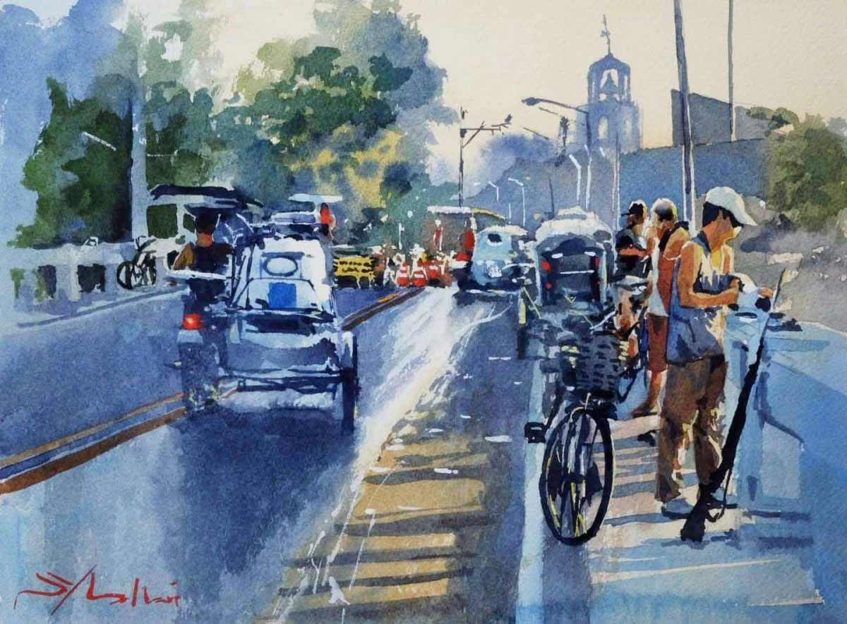 Mallari’s watercolor painting depicted scenes many residents would instantly recognize. One of his pieces was a busy road stretches forward as cars and motorcycles move through traffic, their lights reflecting on the pavement while rows of signboards and power lines crowd the skyline above.