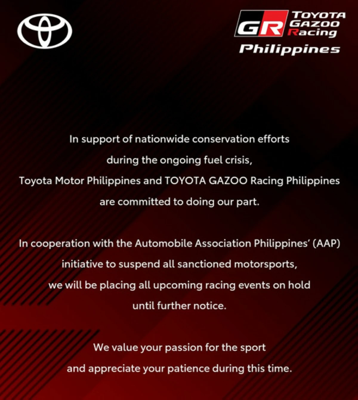 - Toyota Motor Philippines, organizer of the Gazoo Racing Philippine Cup (TGR Philippine Cup), put all its planned races for 2026 on hold due to the ongoing national energy crisis.