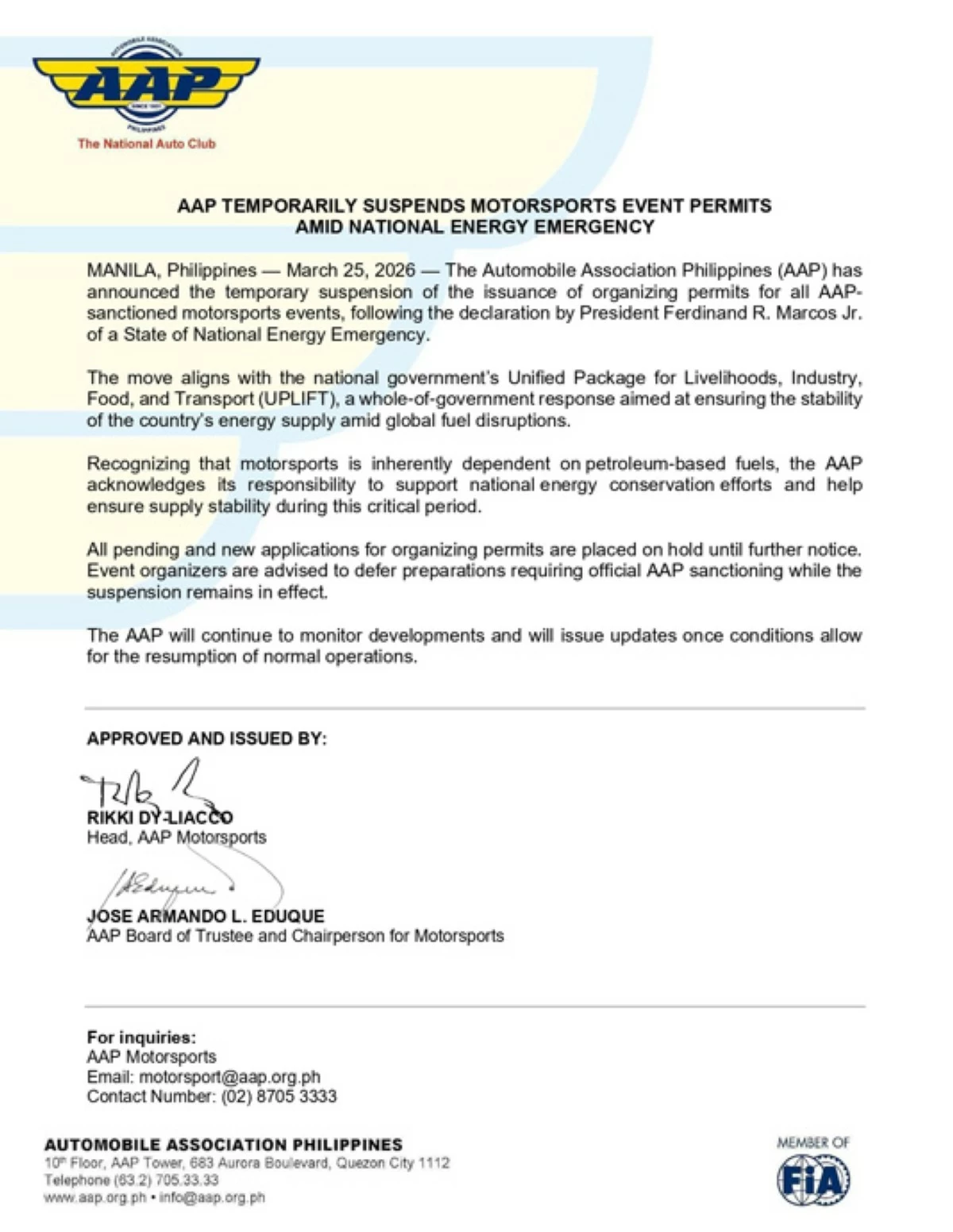 In its announcement, the AAP cited President Ferdinand Bongbong Marcos Jr's recent Executive Order (EO) No. 110, which declared a State of National Energy Emergency in light of the ongoing conflict in the Middle East. The AAP notes that motorsports is still predominantly dependent on petroleum-based fuels, and acknowledges its responsibility to support national energy conservation efforts, particularly the government's Unified Package for Livelihoods, Industry, Food, and Transport (UPLIFT) initiative.
