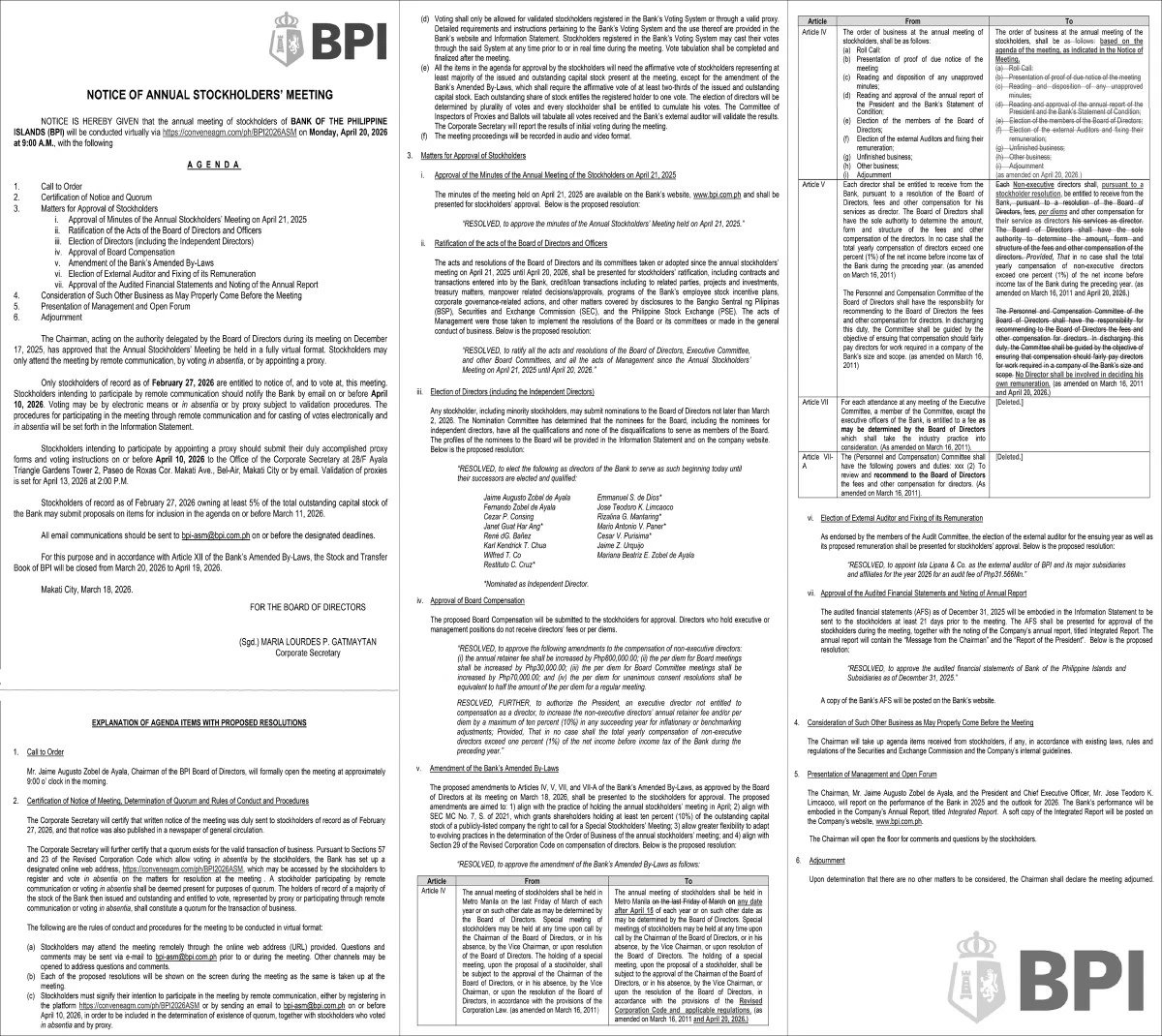 Bank of the Philippine Islands (BPI) will hold its Annual Stockholders’ Meeting on April 20, 2026 (Monday) at 9:00 AM. The meeting will be conducted virtually via https://conveneagm.com/ph/BPI2026ASM. Stockholders of record as of February 27, 2026 are eligible to attend and vote.