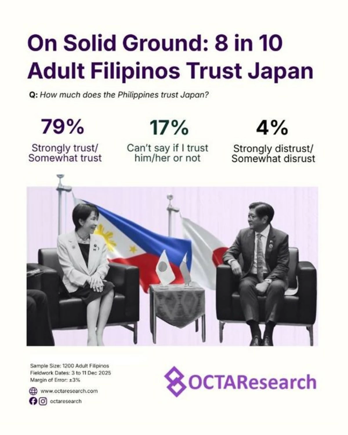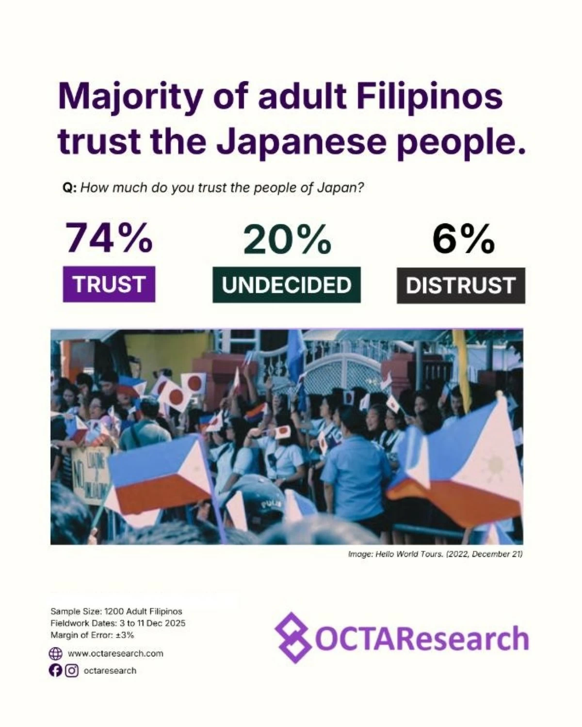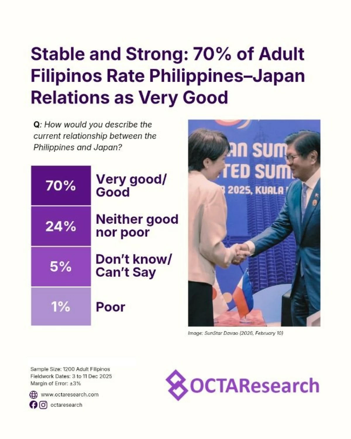 The findings come from the fourth quarter 2025 Tugon ng Masa survey conducted by OCTA Research, which measured public sentiment on Japan-Philippines relations. The study gathered opinions from 1,200 Filipino adults through face-to-face interviews conducted nationwide from December 3 to 11, 2025.