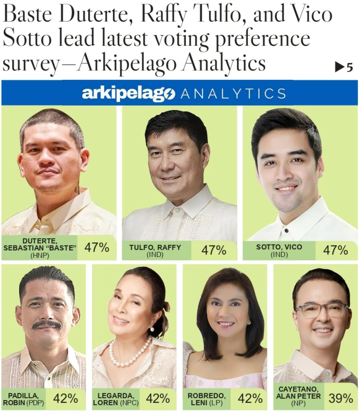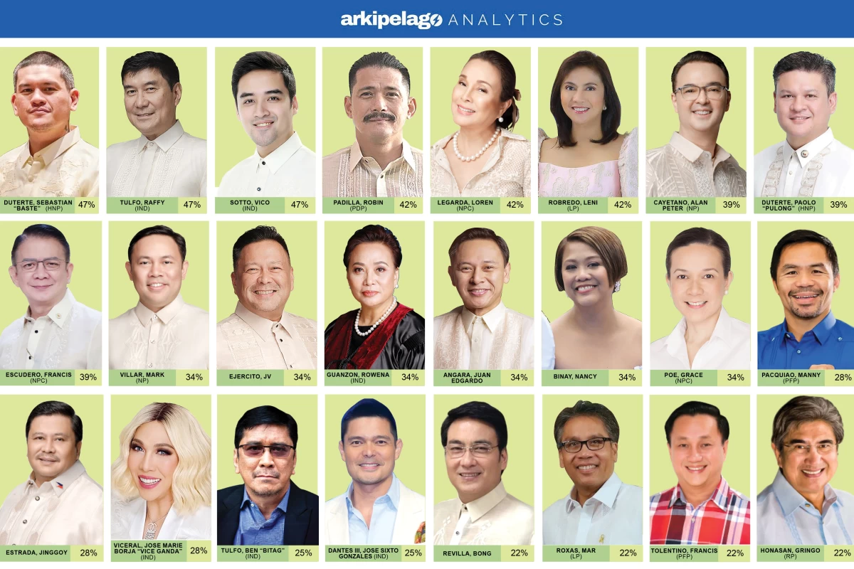 Arkipelago Analytics released its latest voting preference survey, showing a three-way tie for the top spot between Sebastian “Baste” Duterte (HNP), Raffy Tulfo (IND), and Vico Sotto (IND), each with 47 percent voter preference.