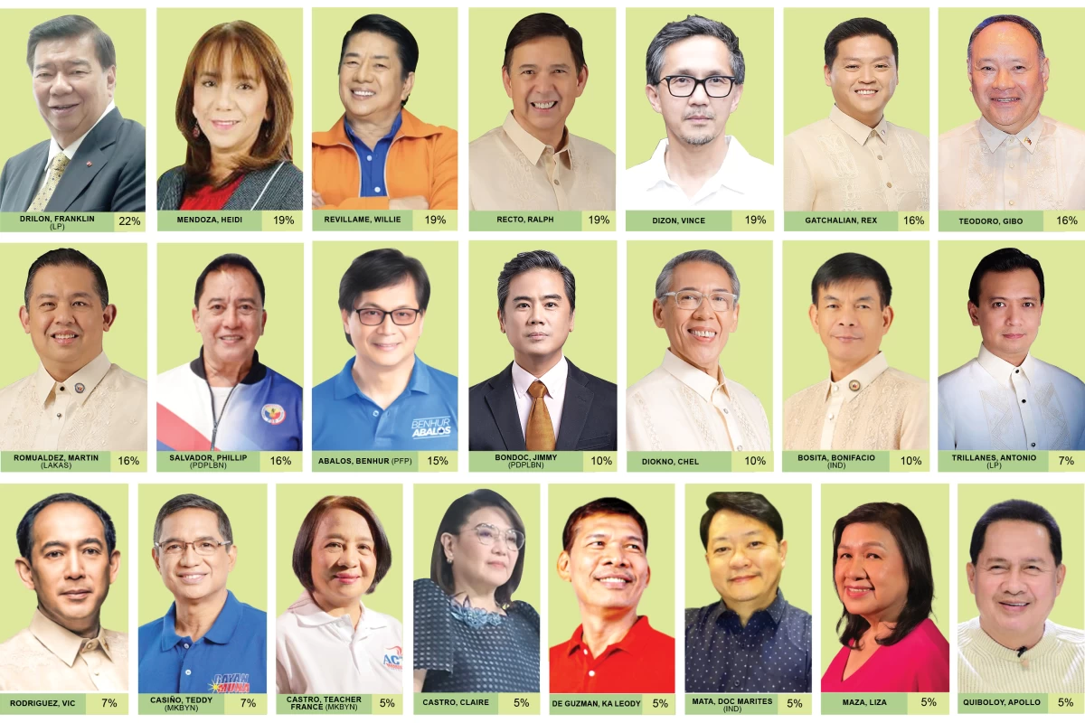 The next cluster includes Bong Revilla, Mar Roxas, Francis Tolentino (PFP), Gringo Honasan (RP), and Franklin Drilon (LP) with 22 percent each.