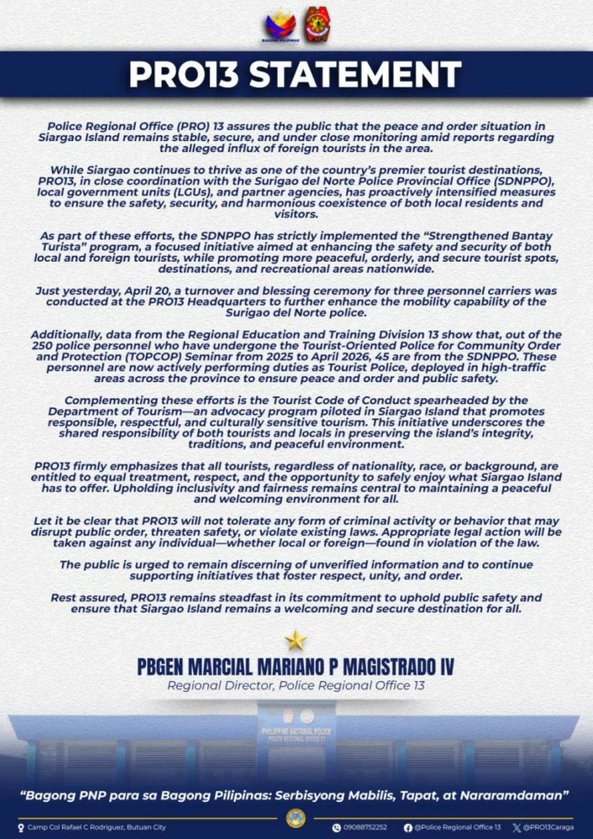 “PRO-13 firmly emphasizes that all tourists, regardless of nationality, race, or background, are entitled to equal treatment, respect, and the opportunity to safely enjoy what Siargao Island has to offer,” PRO-13 Director Police Brig. Gen. Marcial Mariano Magistrado IV said.
