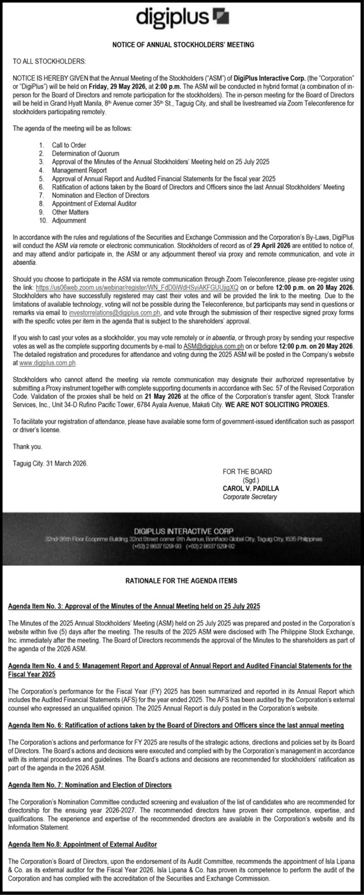 - DigiPlus Interactive Corp. has announced that its Annual Meeting of Stockholders (ASM) will take place on Friday, May 29, 2026. Time, venue, and details to participate are listed here.