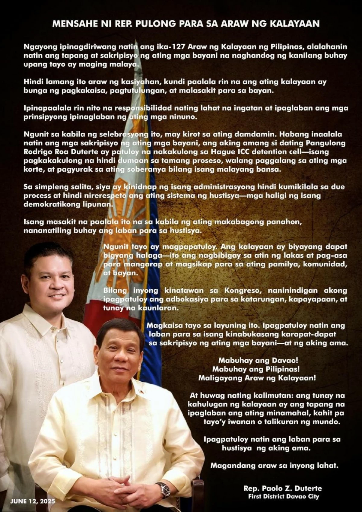 DAVAO CITY – Former President Rodrigo Duterte won’t return to the Philippines as long as Ferdinand R. Marcos Jr. is president, Davao City first district Rep. Paolo Duterte said Monday. Speaking to Duterte supporters outside the International Criminal Court in The Hague, Rep. Duterte said his...
